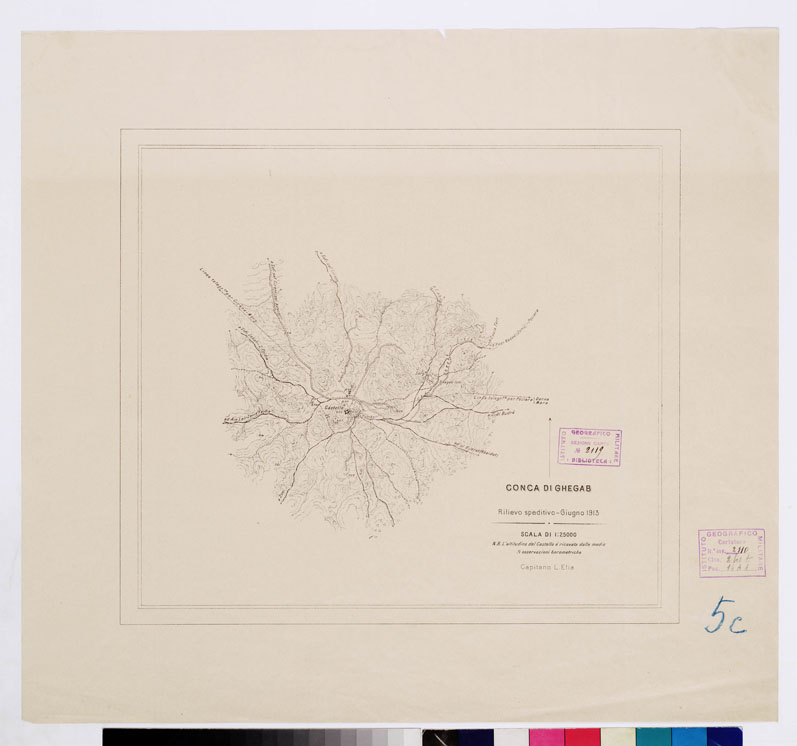 "I.G.M. Rilievo speditivo eseguito dal Capitano L. Elia. Fu stampato in nero e riprodotto in cromo. È uno dei lavori parziali eseguiti da ufficiali dell'I.G.M. messi a disposizione del Comando del Corpo di operazioni durante la nostra occupazione della colonia."