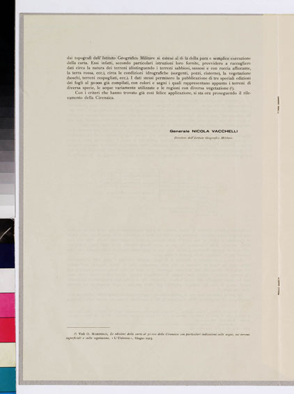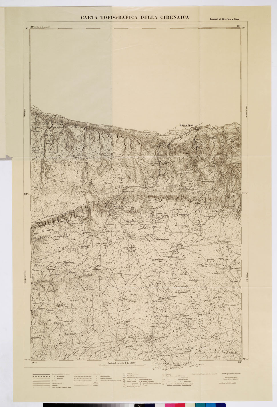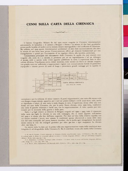 "I.G.M. Un foglio che riunisce i quadranti di Màrsa, Susa e Cirene della carta alla stessa scala (ved. N° 16 d'ordine, N° 2454 d'inventario) presentato in omaggio al Congresso Geografico Internazionale del Cairo. Piegato e contenuto in fascicolo è accompagnato da una nota illustrativa circa le origini della carta."