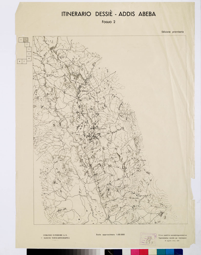 "Rappresentazione orografica a curve di livello. Sulla sinistra il quadro d'unione dell'itinerario. Rilievo speditivo aereofotogrammetrico, toponomastica raccolta per informazioni. Comando Superiore A.O. 7^ Sezione Topocartografica."