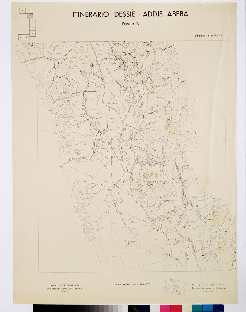 "Rappresentazione orografica a curve di livello. In alto a sinistra il quadro d'unione dell'itinerario. Rilievo speditivo aereofotogrammetrico, toponomastica raccolta per informazioni. Comando Superiore A.O. 7^ Sezione Topocartografica."