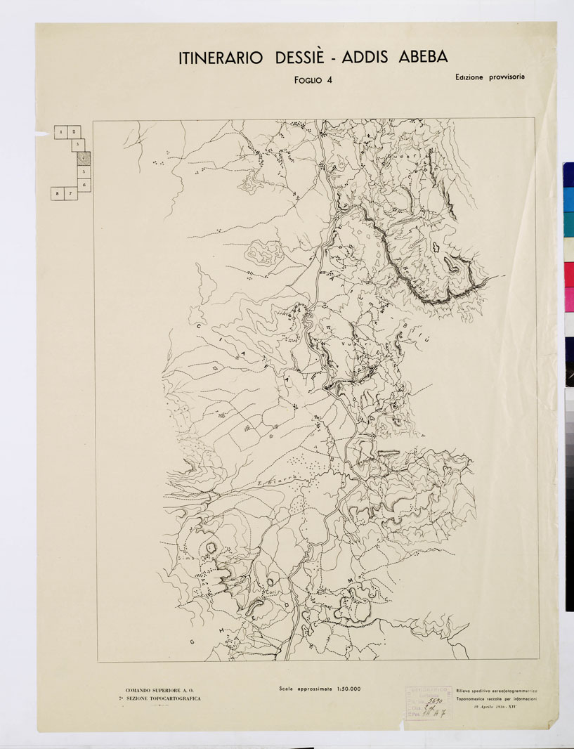 "Rappresentazione orografica a curve di livello. Sulla sinistra il quadro d'unione dell'itinerario. Rilievo speditivo aereofotogrammetrico, toponomastica raccolta per informazioni. Comando Superiore A.O. 7^ Sezione Topocartografica."