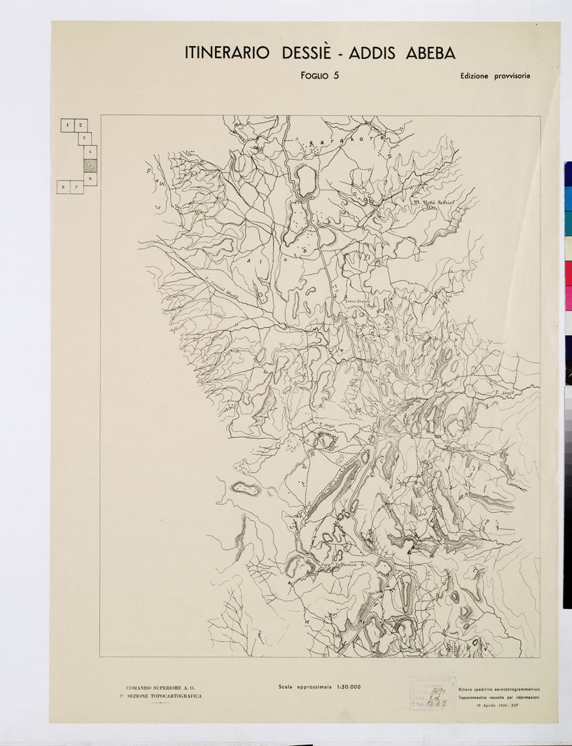 "Rappresentazione orografica a curve di livello. Sulla sinistra il quadro d'unione dell'itinerario. Rilievo speditivo aereofotogrammetrico, toponomastica raccolta per informazioni. Comando Superiore A.O. 7^ Sezione Topocartografica."