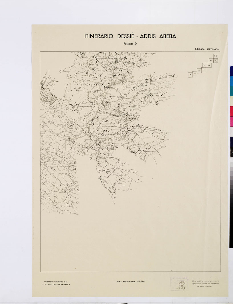 "Rappresentazione orografica a curve di livello. In alto a destra il quadro d'unione dell'itinerario. Rilievo speditivo aereofotogrammetrico, toponomastica raccolta per informazioni. Comando Superiore A.O. 7^ Sezione Topocartografica."