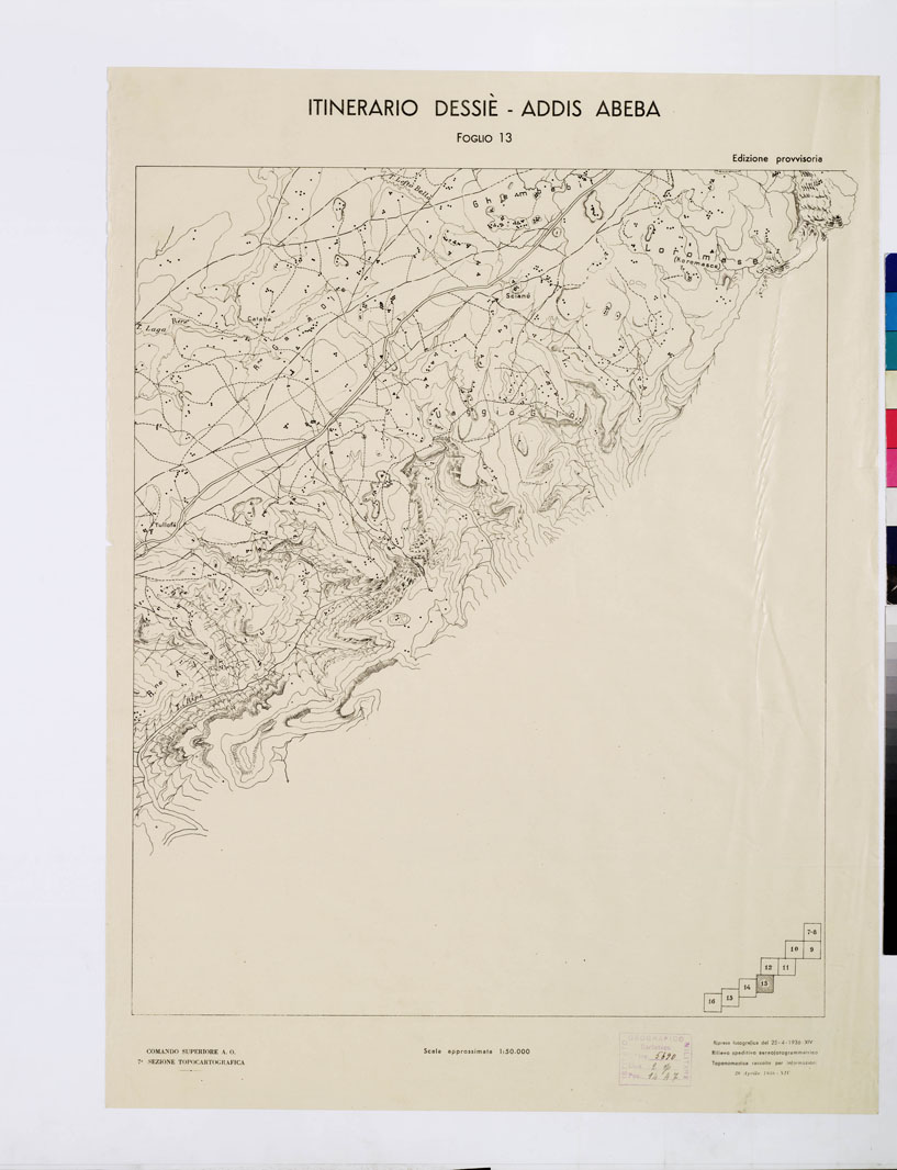 "Rappresentazione orografica a curve di livello. In basso a destra il quadro d'unione dell'itinerario. Rilievo speditivo aereofotogrammetrico, toponomastica raccolta per informazioni. Comando Superiore A.O. 7^ Sezione Topocartografica."