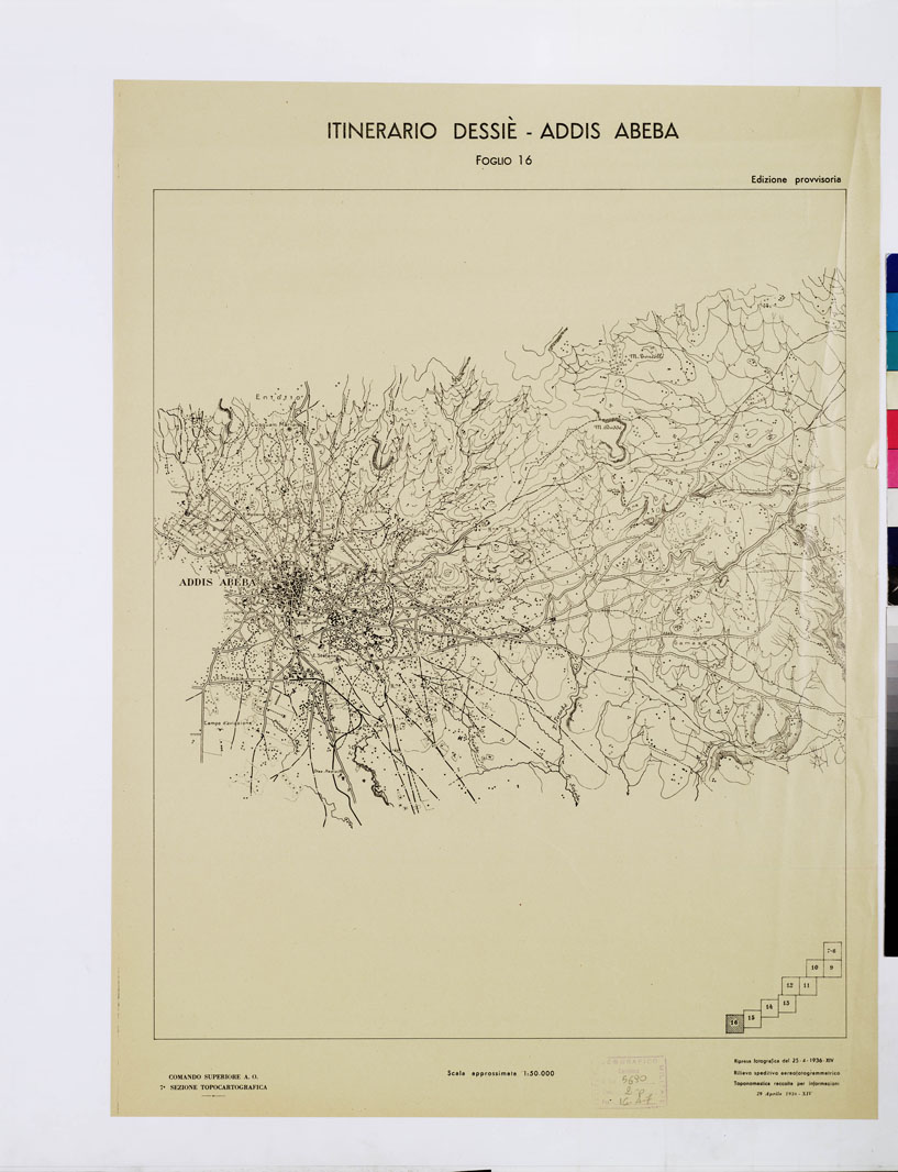 "Rappresentazione orografica a curve di livello. In basso a destra il quadro d'unione dell'itinerario. Rilievo speditivo aereofotogrammetrico, toponomastica raccolta per informazioni. Comando Superiore A.O. 7^ Sezione Topocartografica."