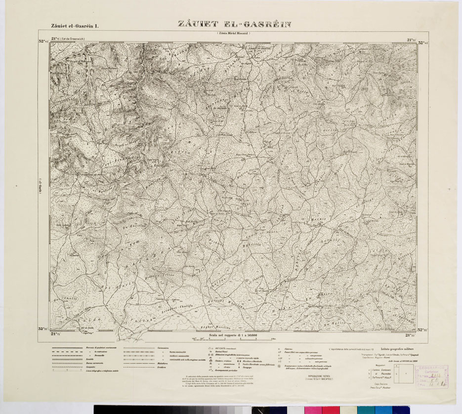 "I.G.M. Riprese nel 1919 le regolari operazioni di rilievo in Cirenaica, dopo l'interruzione del periodo bellico, servirono di punto di partenza, per i nuovi rilievi, le determinazioni astronomiche e geodetiche che già erano state eseguite fino dal 1912 a Bengasi e Derna dallo stesso I.G.M. Con le basi geodetiche già misurate in queste due località e una nuova misurata a es-Safsaf (sud-est di Cirene) si iniziava nel 1919 una nuova triangolazione alla quale si appoggiarono i nuovi lavori di rilievo. Le levate eseguite direttamente alla scala di 1:100.000 con procedimento grafico a mezzo della tavoletta pretoriana, adottando il sistema di proiezione naturale (come per le levate topografiche del Regno) in fogli di 30' di longitudine per 20' di latitudine, furono eseguite tenendo conto delle esigenze per un ingrandimento e un ridisegno al 50.000. La campagna topografica 1919-20 fruttava il rilievo di 6.000 kmq e nel 1921 vennero pubblicate 20 tavolette al 50.000 a cui si aggiunsero in seguito i tre quadranti (1923-24) del foglio di Bengasi. La zona rappresentata risulta quindi compresa tra Bengasi e Sidi Aon sulla costa e dal mare verso terra per una profondità di 40 km. La carta fu stampata in nero con l'adozione di speciali segni convenzionali rispondenti alle particolari condizioni della regione tenendo conto speciale della viabilità e della rete idrografica. Le forme del terreno sono rappresentate con curve di livello tracciate all'equidistanza di 10 metri. Questa carta dà una rappresentazione della Cirenaica ottima e porta un prezioso contributo alla morfologia della regione. Della carta furono pubblicate tre edizioni speciali a mostrare rispettivamente: 1) boschi e culture, 2) pozzi e cisterne, 3) i terreni (v. N° 17 d'ordine, N. 2685 d' inv.). La buona riduzione delle levate al 50.000 permise anche un ingrandimento al 25.000 in 60 fogli pure in nero (ved. N° 18 d'ordine, N. 4165 d' inventario). ."