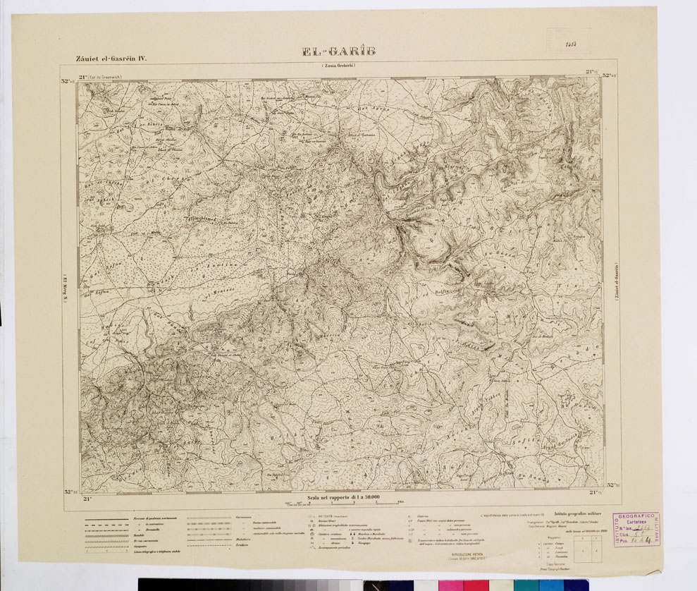 "I.G.M. Riprese nel 1919 le regolari operazioni di rilievo in Cirenaica, dopo l'interruzione del periodo bellico, servirono di punto di partenza, per i nuovi rilievi, le determinazioni astronomiche e geodetiche che già erano state eseguite fino dal 1912 a Bengasi e Derna dallo stesso I.G.M. Con le basi geodetiche già misurate in queste due località e una nuova misurata a es-Safsaf (sud-est di Cirene) si iniziava nel 1919 una nuova triangolazione alla quale si appoggiarono i nuovi lavori di rilievo. Le levate eseguite direttamente alla scala di 1:100.000 con procedimento grafico a mezzo della tavoletta pretoriana, adottando il sistema di proiezione naturale (come per le levate topografiche del Regno) in fogli di 30' di longitudine per 20' di latitudine, furono eseguite tenendo conto delle esigenze per un ingrandimento e un ridisegno al 50.000. La campagna topografica 1919-20 fruttava il rilievo di 6.000 kmq e nel 1921 vennero pubblicate 20 tavolette al 50.000 a cui si aggiunsero in seguito i tre quadranti (1923-24) del foglio di Bengasi. La zona rappresentata risulta quindi compresa tra Bengasi e Sidi Aon sulla costa e dal mare verso terra per una profondità di 40 km. La carta fu stampata in nero con l'adozione di speciali segni convenzionali rispondenti alle particolari condizioni della regione tenendo conto speciale della viabilità e della rete idrografica. Le forme del terreno sono rappresentate con curve di livello tracciate all'equidistanza di 10 metri. Questa carta dà una rappresentazione della Cirenaica ottima e porta un prezioso contributo alla morfologia della regione. Della carta furono pubblicate tre edizioni speciali a mostrare rispettivamente: 1) boschi e culture, 2) pozzi e cisterne, 3) i terreni (v. N° 17 d'ordine, N. 2685 d' inv.). La buona riduzione delle levate al 50.000 permise anche un ingrandimento al 25.000 in 60 fogli pure in nero (ved. N° 18 d'ordine, N. 4165 d' inventario). ."