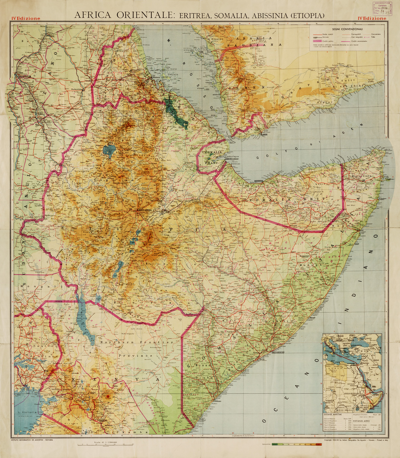 "Rappresentazione orografica a tinte ipsometriche. In alto a destra vi sono i segni convenzionali. Nel riquadro in basso a destra lke distanze aeree e marittime fra l'Africa, il Medio Oriente e l'Europa. Istituto Geografico De Agostini, Novara."
