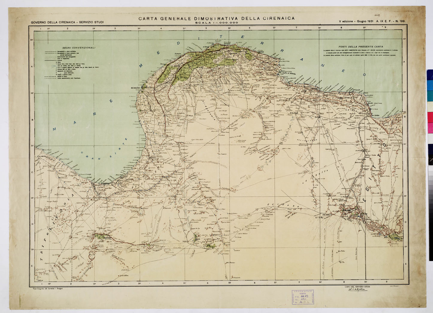 "Governo della Cirenaica. Ufficio Studi. Carta in un sol foglio ridotta dalla carta dimostrativa della Cirenaica all'1:400.000. Nelle rispettive edizioni 4^ e 5^, in sostituzione di quella pubblicata nel 1927 in terza edizione. La carta mostra il terreno a fondo unito giallino con vegetazioni in verde e planimetria in nero: sono distinte le carreggiabili a fondo artificiale e a fondo naturale, le comunicazioni non carreggiabili, le piste di ricognizione, le ferrovie. Indica inoltre le zauie, le rovine, i pozzi, le cisterne, i marabutti (con e senza fabbricato), le tombe, i cimiteri arabi, i confini di stato e quelli amministrativi. Gli uadi sono segnati in colore azzurro. La carta si estende da 33°10' a 28°20' lat. e da 17°40' a 25°50' di long. est."