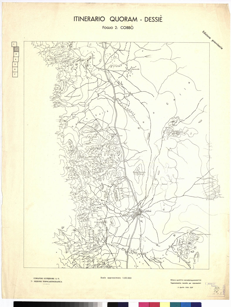 "Rappresentazione orografica a curve di livello. In alto a sinistra il quadro d'unione dell'itinerario. Rilievo speditivo aereofotogrammetrico, toponomastica raccolta per informazioni. Comando Superiore A.O. 7^ Sezione Topocartografica."