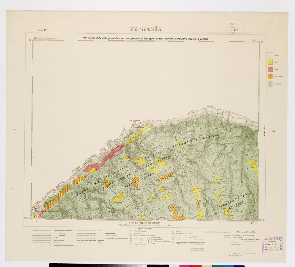 "Tre edizioni speciali in cromo: 1) Boschi e culture 2) pozzi e cisterne 3) varie specie di terreni. I.G.M. Le tre edizioni speciali sono fondate sui dati raccolti dai topografi dell' I.G.M. incaricati della Missione Topografica degli anni 1919-20 per le levate al 100.000 da impiegarsi per le carte al 50.000 (ved. N° 16 d'ordine, N. 2454 d'inventario). Ad essi ufficiali erano state date particolari istruzioni affinché fossero eseguite il maggior numero possibile di osservazioni circa lo studio del terreno, delle condizioni idrografiche e della vegetazione. Le carte costituiscono perciò un prezioso contributo alla conoscenza della Cirenaica. Mediante colori e segni esse indicano le particolari diversità della vegetazione spontanea (boschi radi o fitti, macchie, ecc.), terreni incolti e colture, le particolari condizioni delle acque (pozzi, sorgenti, cisterne, laghi invernali, caverne naturali) e diversità dei terreni superficiali, venendo a essere quindi dimostrazioni di valore scientifico e pratico. Le notizie che dai tre tipi di carte si ricavano permettono di desumere interessanti conclusioni relative al paese e alle sue condizioni idrografiche e agricole e allo studio del suolo."