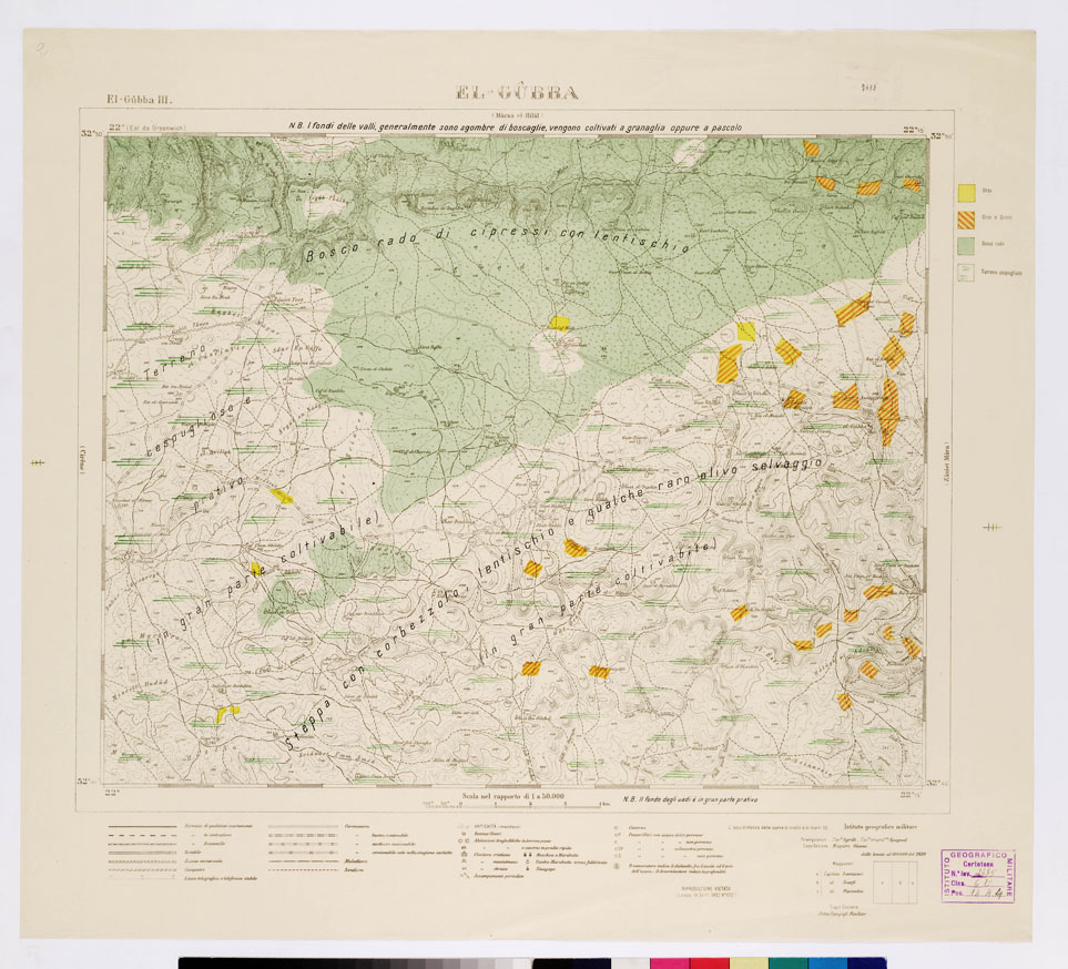 "Tre edizioni speciali in cromo: 1) Boschi e culture 2) pozzi e cisterne 3) varie specie di terreni. I.G.M. Le tre edizioni speciali sono fondate sui dati raccolti dai topografi dell' I.G.M. incaricati della Missione Topografica degli anni 1919-20 per le levate al 100.000 da impiegarsi per le carte al 50.000 (ved. N° 16 d'ordine, N. 2454 d'inventario). Ad essi ufficiali erano state date particolari istruzioni affinché fossero eseguite il maggior numero possibile di osservazioni circa lo studio del terreno, delle condizioni idrografiche e della vegetazione. Le carte costituiscono perciò un prezioso contributo alla conoscenza della Cirenaica. Mediante colori e segni esse indicano le particolari diversità della vegetazione spontanea (boschi radi o fitti, macchie, ecc.), terreni incolti e colture, le particolari condizioni delle acque (pozzi, sorgenti, cisterne, laghi invernali, caverne naturali) e diversità dei terreni superficiali, venendo a essere quindi dimostrazioni di valore scientifico e pratico. Le notizie che dai tre tipi di carte si ricavano permettono di desumere interessanti conclusioni relative al paese e alle sue condizioni idrografiche e agricole e allo studio del suolo."