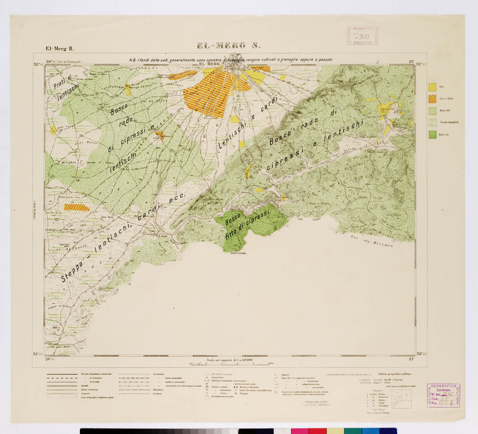 "Tre edizioni speciali in cromo: 1) Boschi e culture 2) pozzi e cisterne 3) varie specie di terreni. I.G.M. Le tre edizioni speciali sono fondate sui dati raccolti dai topografi dell' I.G.M. incaricati della Missione Topografica degli anni 1919-20 per le levate al 100.000 da impiegarsi per le carte al 50.000 (ved. N° 16 d'ordine, N. 2454 d'inventario). Ad essi ufficiali erano state date particolari istruzioni affinché fossero eseguite il maggior numero possibile di osservazioni circa lo studio del terreno, delle condizioni idrografiche e della vegetazione. Le carte costituiscono perciò un prezioso contributo alla conoscenza della Cirenaica. Mediante colori e segni esse indicano le particolari diversità della vegetazione spontanea (boschi radi o fitti, macchie, ecc.), terreni incolti e colture, le particolari condizioni delle acque (pozzi, sorgenti, cisterne, laghi invernali, caverne naturali) e diversità dei terreni superficiali, venendo a essere quindi dimostrazioni di valore scientifico e pratico. Le notizie che dai tre tipi di carte si ricavano permettono di desumere interessanti conclusioni relative al paese e alle sue condizioni idrografiche e agricole e allo studio del suolo."