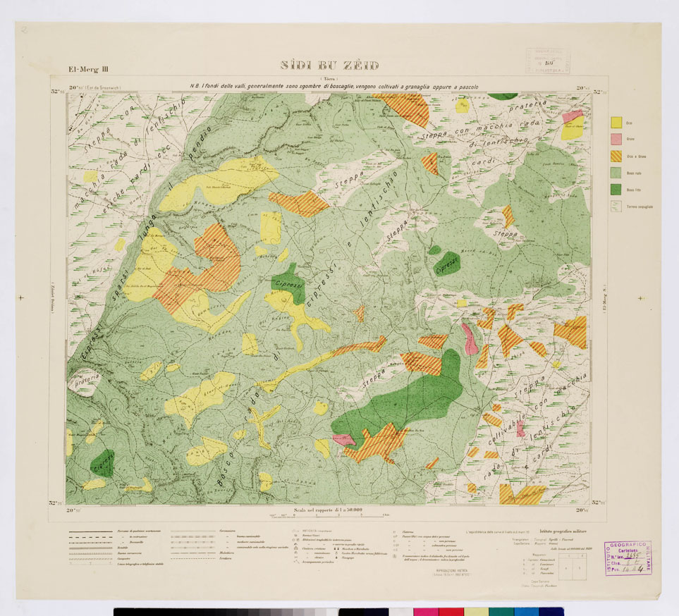 "Tre edizioni speciali in cromo: 1) Boschi e culture 2) pozzi e cisterne 3) varie specie di terreni. I.G.M. Le tre edizioni speciali sono fondate sui dati raccolti dai topografi dell' I.G.M. incaricati della Missione Topografica degli anni 1919-20 per le levate al 100.000 da impiegarsi per le carte al 50.000 (ved. N° 16 d'ordine, N. 2454 d'inventario). Ad essi ufficiali erano state date particolari istruzioni affinché fossero eseguite il maggior numero possibile di osservazioni circa lo studio del terreno, delle condizioni idrografiche e della vegetazione. Le carte costituiscono perciò un prezioso contributo alla conoscenza della Cirenaica. Mediante colori e segni esse indicano le particolari diversità della vegetazione spontanea (boschi radi o fitti, macchie, ecc.), terreni incolti e colture, le particolari condizioni delle acque (pozzi, sorgenti, cisterne, laghi invernali, caverne naturali) e diversità dei terreni superficiali, venendo a essere quindi dimostrazioni di valore scientifico e pratico. Le notizie che dai tre tipi di carte si ricavano permettono di desumere interessanti conclusioni relative al paese e alle sue condizioni idrografiche e agricole e allo studio del suolo."