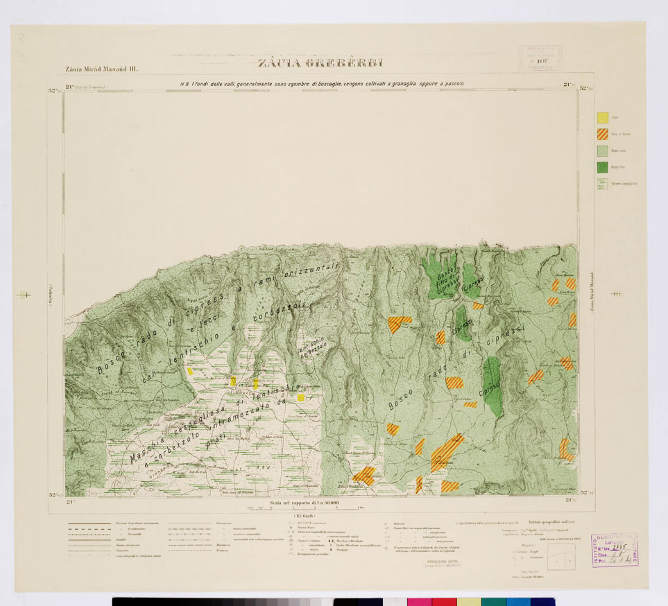 "Tre edizioni speciali in cromo: 1) Boschi e culture 2) pozzi e cisterne 3) varie specie di terreni. I.G.M. Le tre edizioni speciali sono fondate sui dati raccolti dai topografi dell' I.G.M. incaricati della Missione Topografica degli anni 1919-20 per le levate al 100.000 da impiegarsi per le carte al 50.000 (ved. N° 16 d'ordine, N. 2454 d'inventario). Ad essi ufficiali erano state date particolari istruzioni affinché fossero eseguite il maggior numero possibile di osservazioni circa lo studio del terreno, delle condizioni idrografiche e della vegetazione. Le carte costituiscono perciò un prezioso contributo alla conoscenza della Cirenaica. Mediante colori e segni esse indicano le particolari diversità della vegetazione spontanea (boschi radi o fitti, macchie, ecc.), terreni incolti e colture, le particolari condizioni delle acque (pozzi, sorgenti, cisterne, laghi invernali, caverne naturali) e diversità dei terreni superficiali, venendo a essere quindi dimostrazioni di valore scientifico e pratico. Le notizie che dai tre tipi di carte si ricavano permettono di desumere interessanti conclusioni relative al paese e alle sue condizioni idrografiche e agricole e allo studio del suolo."