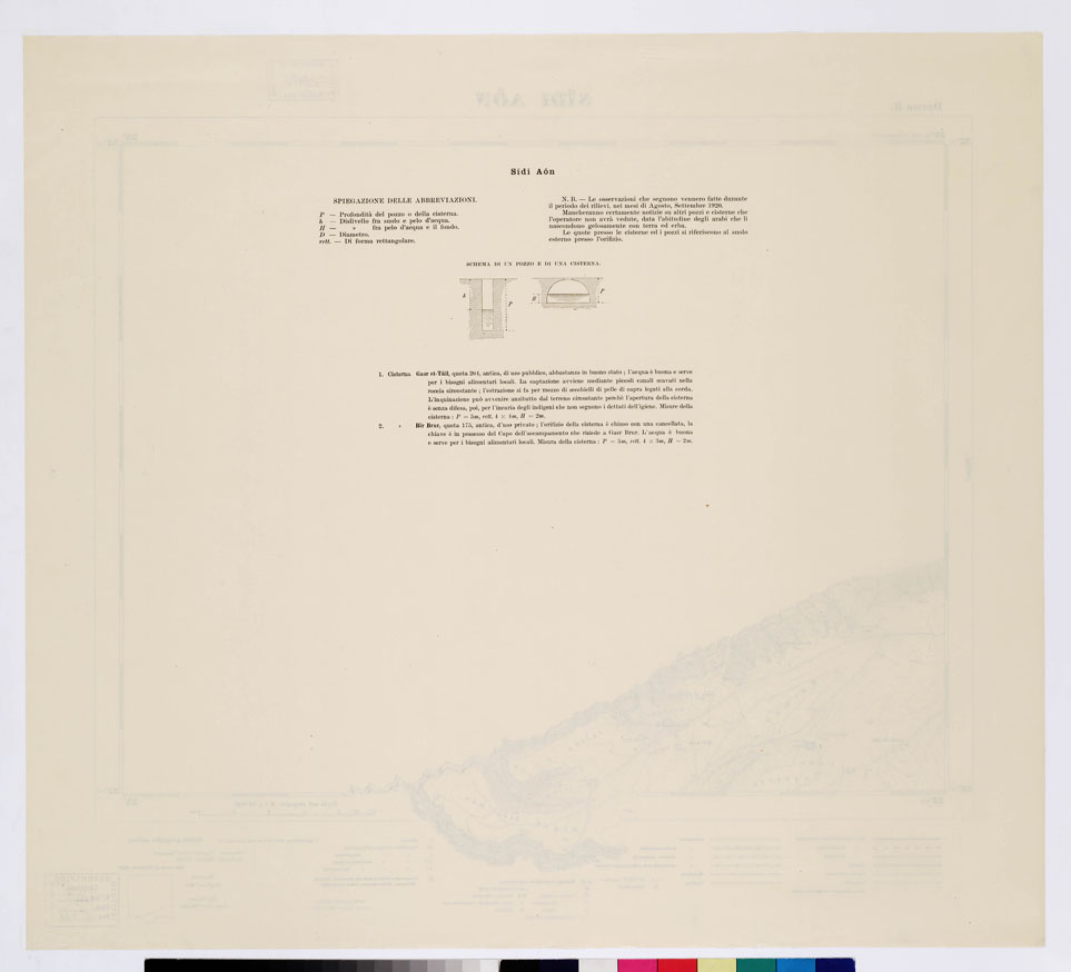 "Tre edizioni speciali in cromo: 1) Boschi e culture 2) pozzi e cisterne 3) varie specie di terreni. I.G.M. Le tre edizioni speciali sono fondate sui dati raccolti dai topografi dell' I.G.M. incaricati della Missione Topografica degli anni 1919-20 per le levate al 100.000 da impiegarsi per le carte al 50.000 (ved. N° 16 d'ordine, N. 2454 d'inventario). Ad essi ufficiali erano state date particolari istruzioni affinché fossero eseguite il maggior numero possibile di osservazioni circa lo studio del terreno, delle condizioni idrografiche e della vegetazione. Le carte costituiscono perciò un prezioso contributo alla conoscenza della Cirenaica. Mediante colori e segni esse indicano le particolari diversità della vegetazione spontanea (boschi radi o fitti, macchie, ecc.), terreni incolti e colture, le particolari condizioni delle acque (pozzi, sorgenti, cisterne, laghi invernali, caverne naturali) e diversità dei terreni superficiali, venendo a essere quindi dimostrazioni di valore scientifico e pratico. Le notizie che dai tre tipi di carte si ricavano permettono di desumere interessanti conclusioni relative al paese e alle sue condizioni idrografiche e agricole e allo studio del suolo."