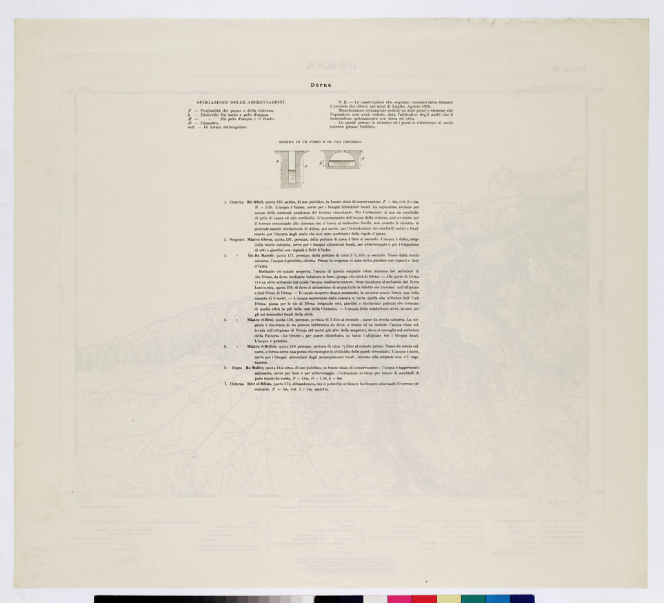 "Tre edizioni speciali in cromo: 1) Boschi e culture 2) pozzi e cisterne 3) varie specie di terreni. I.G.M. Le tre edizioni speciali sono fondate sui dati raccolti dai topografi dell' I.G.M. incaricati della Missione Topografica degli anni 1919-20 per le levate al 100.000 da impiegarsi per le carte al 50.000 (ved. N° 16 d'ordine, N. 2454 d'inventario). Ad essi ufficiali erano state date particolari istruzioni affinché fossero eseguite il maggior numero possibile di osservazioni circa lo studio del terreno, delle condizioni idrografiche e della vegetazione. Le carte costituiscono perciò un prezioso contributo alla conoscenza della Cirenaica. Mediante colori e segni esse indicano le particolari diversità della vegetazione spontanea (boschi radi o fitti, macchie, ecc.), terreni incolti e colture, le particolari condizioni delle acque (pozzi, sorgenti, cisterne, laghi invernali, caverne naturali) e diversità dei terreni superficiali, venendo a essere quindi dimostrazioni di valore scientifico e pratico. Le notizie che dai tre tipi di carte si ricavano permettono di desumere interessanti conclusioni relative al paese e alle sue condizioni idrografiche e agricole e allo studio del suolo."