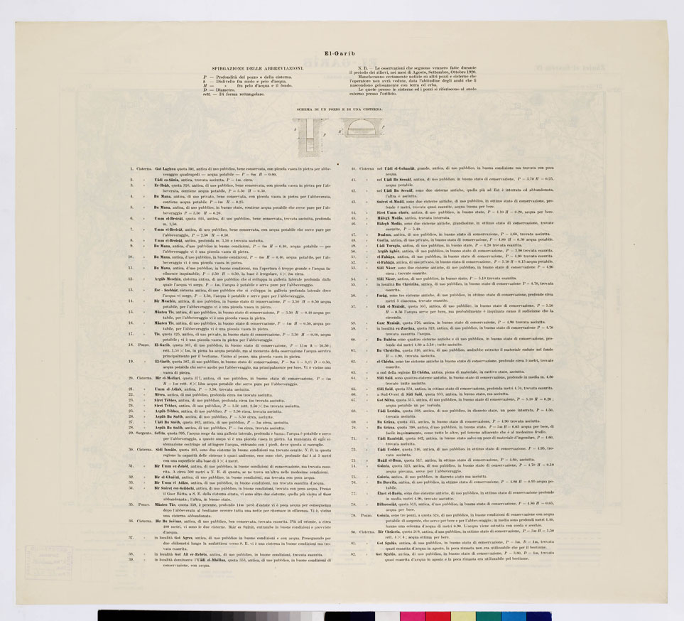 "Tre edizioni speciali in cromo: 1) Boschi e culture 2) pozzi e cisterne 3) varie specie di terreni. I.G.M. Le tre edizioni speciali sono fondate sui dati raccolti dai topografi dell' I.G.M. incaricati della Missione Topografica degli anni 1919-20 per le levate al 100.000 da impiegarsi per le carte al 50.000 (ved. N° 16 d'ordine, N. 2454 d'inventario). Ad essi ufficiali erano state date particolari istruzioni affinché fossero eseguite il maggior numero possibile di osservazioni circa lo studio del terreno, delle condizioni idrografiche e della vegetazione. Le carte costituiscono perciò un prezioso contributo alla conoscenza della Cirenaica. Mediante colori e segni esse indicano le particolari diversità della vegetazione spontanea (boschi radi o fitti, macchie, ecc.), terreni incolti e colture, le particolari condizioni delle acque (pozzi, sorgenti, cisterne, laghi invernali, caverne naturali) e diversità dei terreni superficiali, venendo a essere quindi dimostrazioni di valore scientifico e pratico. Le notizie che dai tre tipi di carte si ricavano permettono di desumere interessanti conclusioni relative al paese e alle sue condizioni idrografiche e agricole e allo studio del suolo."