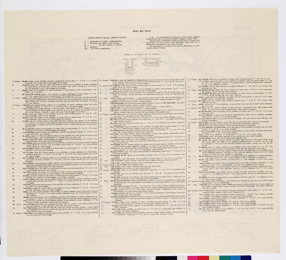 "Tre edizioni speciali in cromo: 1) Boschi e culture 2) pozzi e cisterne 3) varie specie di terreni. I.G.M. Le tre edizioni speciali sono fondate sui dati raccolti dai topografi dell' I.G.M. incaricati della Missione Topografica degli anni 1919-20 per le levate al 100.000 da impiegarsi per le carte al 50.000 (ved. N° 16 d'ordine, N. 2454 d'inventario). Ad essi ufficiali erano state date particolari istruzioni affinché fossero eseguite il maggior numero possibile di osservazioni circa lo studio del terreno, delle condizioni idrografiche e della vegetazione. Le carte costituiscono perciò un prezioso contributo alla conoscenza della Cirenaica. Mediante colori e segni esse indicano le particolari diversità della vegetazione spontanea (boschi radi o fitti, macchie, ecc.), terreni incolti e colture, le particolari condizioni delle acque (pozzi, sorgenti, cisterne, laghi invernali, caverne naturali) e diversità dei terreni superficiali, venendo a essere quindi dimostrazioni di valore scientifico e pratico. Le notizie che dai tre tipi di carte si ricavano permettono di desumere interessanti conclusioni relative al paese e alle sue condizioni idrografiche e agricole e allo studio del suolo."