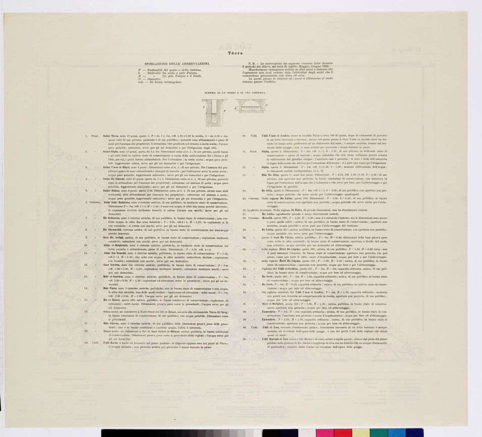 "Tre edizioni speciali in cromo: 1) Boschi e culture 2) pozzi e cisterne 3) varie specie di terreni. I.G.M. Le tre edizioni speciali sono fondate sui dati raccolti dai topografi dell' I.G.M. incaricati della Missione Topografica degli anni 1919-20 per le levate al 100.000 da impiegarsi per le carte al 50.000 (ved. N° 16 d'ordine, N. 2454 d'inventario). Ad essi ufficiali erano state date particolari istruzioni affinché fossero eseguite il maggior numero possibile di osservazioni circa lo studio del terreno, delle condizioni idrografiche e della vegetazione. Le carte costituiscono perciò un prezioso contributo alla conoscenza della Cirenaica. Mediante colori e segni esse indicano le particolari diversità della vegetazione spontanea (boschi radi o fitti, macchie, ecc.), terreni incolti e colture, le particolari condizioni delle acque (pozzi, sorgenti, cisterne, laghi invernali, caverne naturali) e diversità dei terreni superficiali, venendo a essere quindi dimostrazioni di valore scientifico e pratico. Le notizie che dai tre tipi di carte si ricavano permettono di desumere interessanti conclusioni relative al paese e alle sue condizioni idrografiche e agricole e allo studio del suolo."