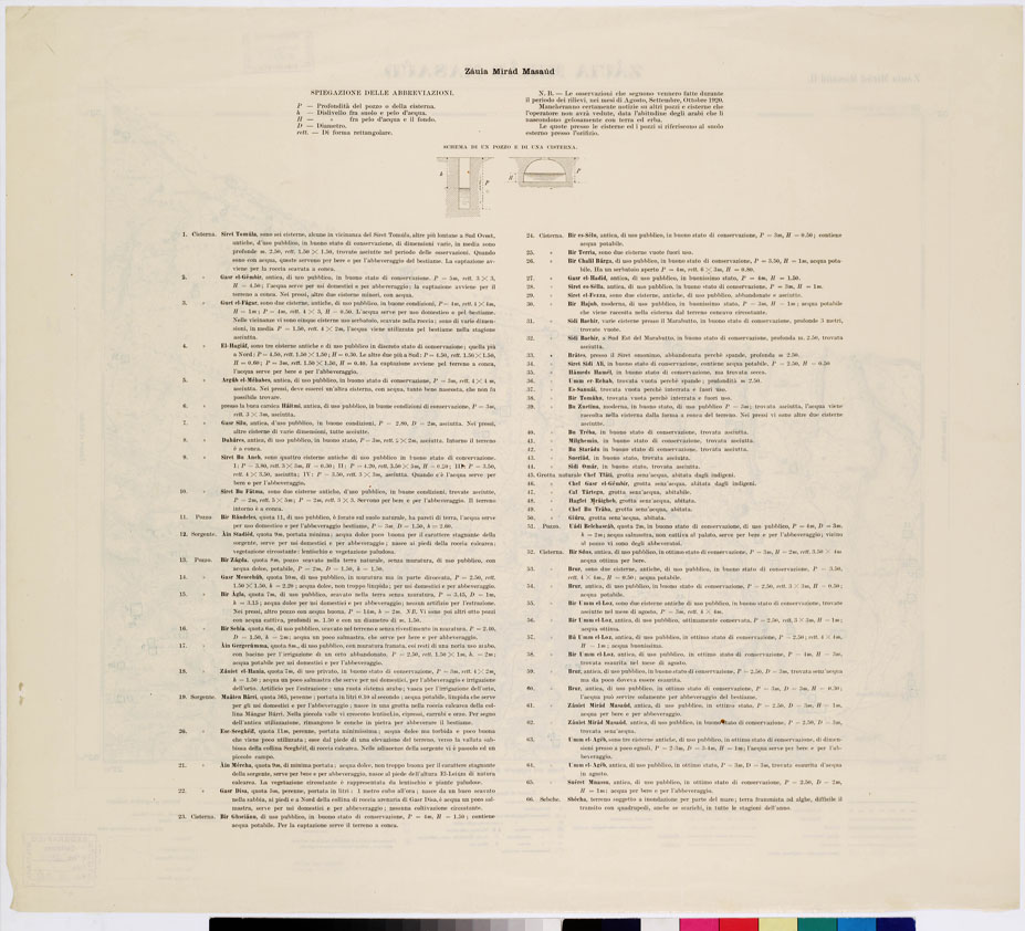"Tre edizioni speciali in cromo: 1) Boschi e culture 2) pozzi e cisterne 3) varie specie di terreni. I.G.M. Le tre edizioni speciali sono fondate sui dati raccolti dai topografi dell' I.G.M. incaricati della Missione Topografica degli anni 1919-20 per le levate al 100.000 da impiegarsi per le carte al 50.000 (ved. N° 16 d'ordine, N. 2454 d'inventario). Ad essi ufficiali erano state date particolari istruzioni affinché fossero eseguite il maggior numero possibile di osservazioni circa lo studio del terreno, delle condizioni idrografiche e della vegetazione. Le carte costituiscono perciò un prezioso contributo alla conoscenza della Cirenaica. Mediante colori e segni esse indicano le particolari diversità della vegetazione spontanea (boschi radi o fitti, macchie, ecc.), terreni incolti e colture, le particolari condizioni delle acque (pozzi, sorgenti, cisterne, laghi invernali, caverne naturali) e diversità dei terreni superficiali, venendo a essere quindi dimostrazioni di valore scientifico e pratico. Le notizie che dai tre tipi di carte si ricavano permettono di desumere interessanti conclusioni relative al paese e alle sue condizioni idrografiche e agricole e allo studio del suolo."