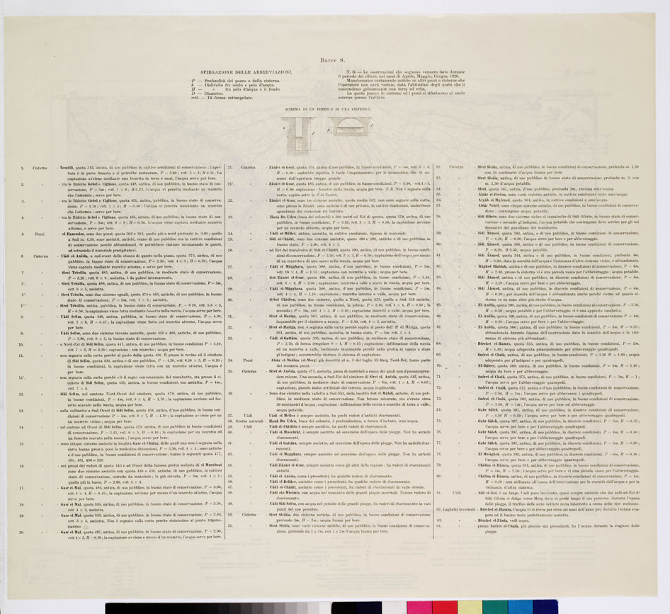 "Tre edizioni speciali in cromo: 1) Boschi e culture 2) pozzi e cisterne 3) varie specie di terreni. I.G.M. Le tre edizioni speciali sono fondate sui dati raccolti dai topografi dell' I.G.M. incaricati della Missione Topografica degli anni 1919-20 per le levate al 100.000 da impiegarsi per le carte al 50.000 (ved. N° 16 d'ordine, N. 2454 d'inventario). Ad essi ufficiali erano state date particolari istruzioni affinché fossero eseguite il maggior numero possibile di osservazioni circa lo studio del terreno, delle condizioni idrografiche e della vegetazione. Le carte costituiscono perciò un prezioso contributo alla conoscenza della Cirenaica. Mediante colori e segni esse indicano le particolari diversità della vegetazione spontanea (boschi radi o fitti, macchie, ecc.), terreni incolti e colture, le particolari condizioni delle acque (pozzi, sorgenti, cisterne, laghi invernali, caverne naturali) e diversità dei terreni superficiali, venendo a essere quindi dimostrazioni di valore scientifico e pratico. Le notizie che dai tre tipi di carte si ricavano permettono di desumere interessanti conclusioni relative al paese e alle sue condizioni idrografiche e agricole e allo studio del suolo."