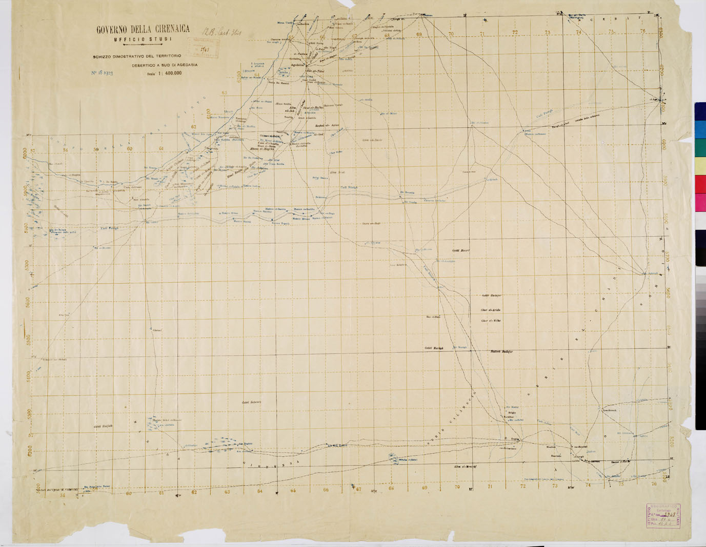 "Governo della Cirenaica. Ufficio Studi. Un foglio in tipo-litografia limitato alla sola planimetria. Stampa in due colori. "
