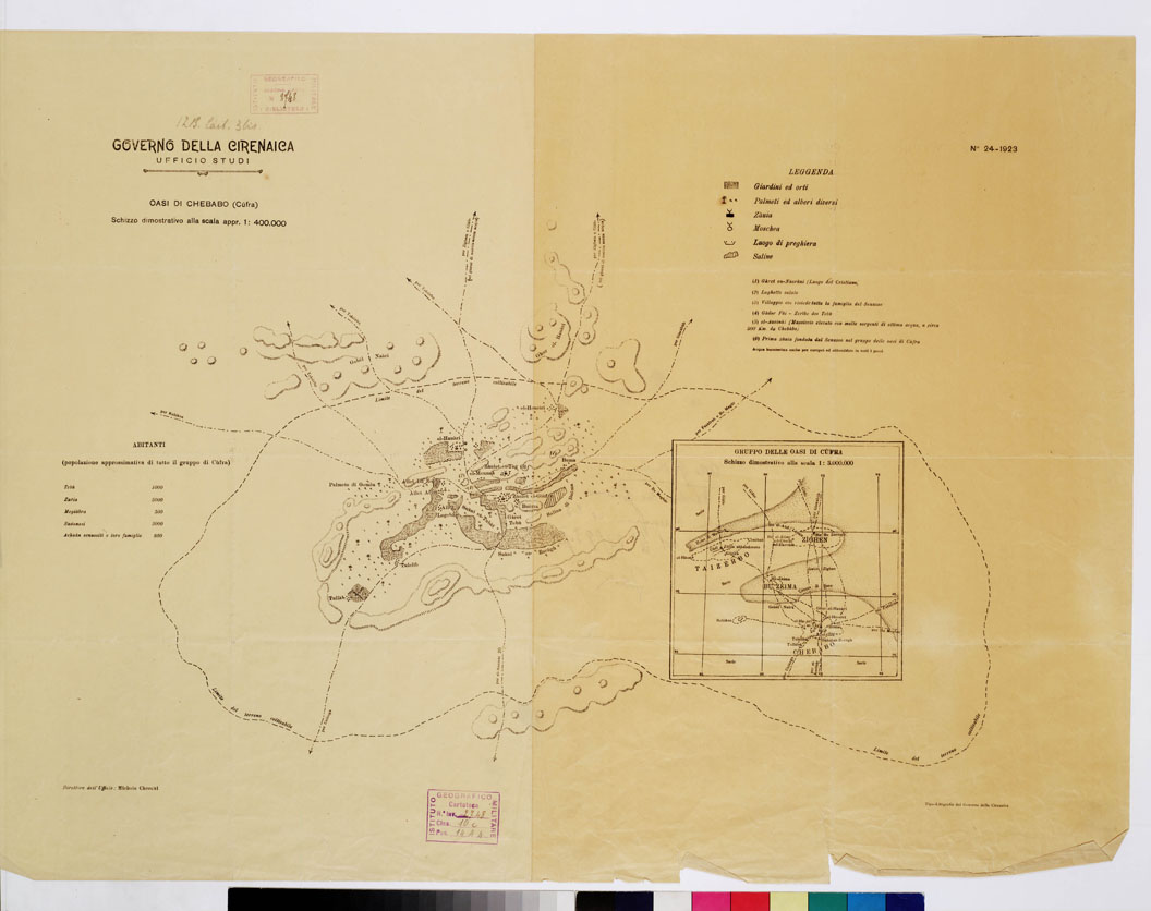 "Governo della Cirenaica. Ufficio Studi. Schizzo dimostrativo con inserito una bozza del gruppo delle oasi di Cufra alla scala di 1:3.000.000 ed i dati approssimativi sulla popolazione di tutto il gruppo di Cufra."