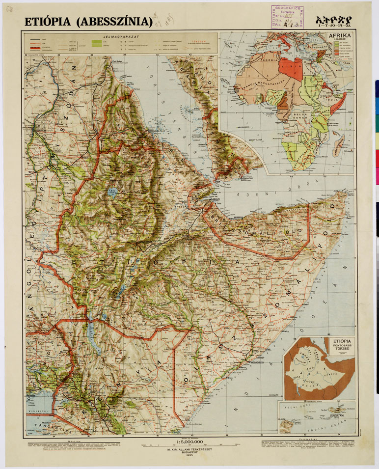"Rappresentazione orografica a sfumo. In alto la legenda dei segni convenzionali. Nel riquadro in alto a destra una carta dellAfrica alla scala di 1:50.000.000 nel riquadro in basso a destra una carta dell'Etiopia. Allami Terkepest, Budapest."