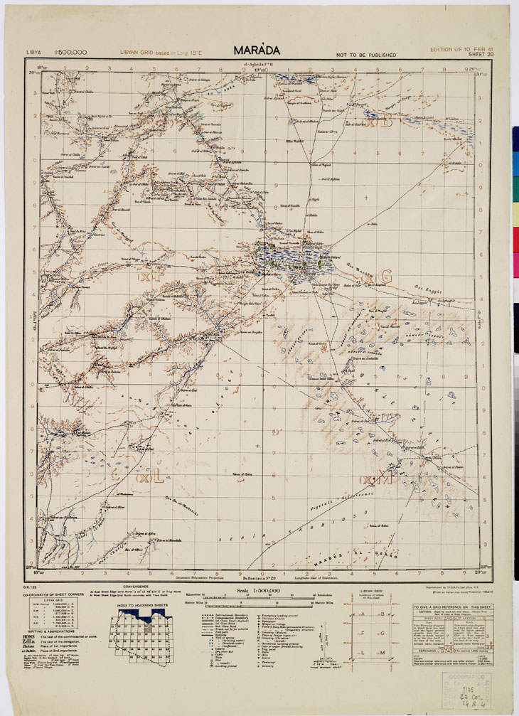 "Rappresentazione orografica dimostrativa. In origine la carta si componeva di 55 fogli. In basso sono presenti: il quadro d'unione, la legenda dei segni convenzionali e due scale grafiche in miglia e chilometri. Grafia in lingua inglese. Governo della Tripolitania e della Cirenaica, Ufficio Studi."
