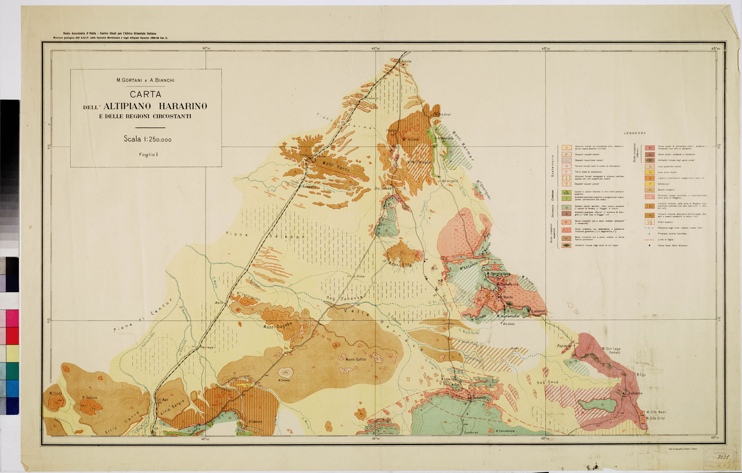 "Rappresentazione orografica a curve di livello. A destra la leggenda dei colori. Reale Accademia d'Italia - Centro Studi per l'Africa Orientale Italiana autori: M. Gortani e A. Bianchi. Stabilimento Cartografico G. Giardi, Firenze."