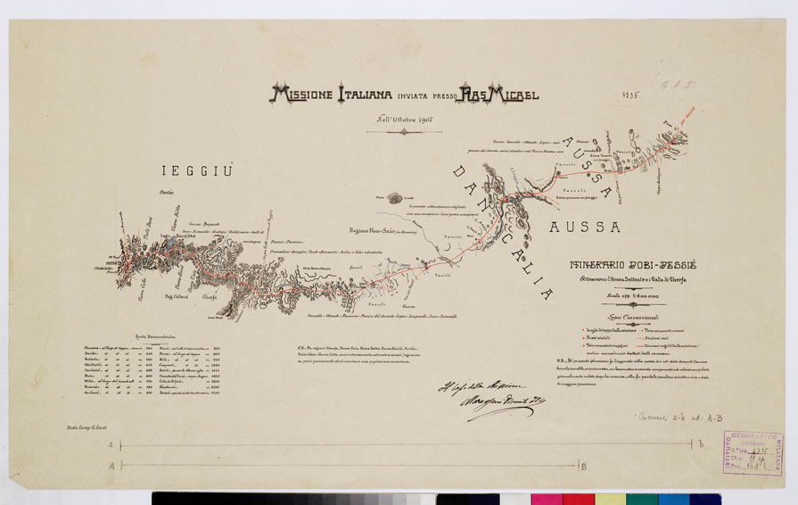 "Missione Italiana inviata presso Ras Micael nell'ottobre 1907. Il presente itinerario fu disegnato colla scorta dei soli dati desunti da una bussola tascabile, un pedometro, un barometro aneroide compensato e di schizzi compilati giornalmente subito dopo la marcia. Non fu possibile prendere orientamenti e dati di maggior precisione. Rappresentazione orografica a tratteggio. Sotto al titolo i segni convenzionali. In basso a sinistra le quote barometriche. Studio Cartografico G. Giardi."