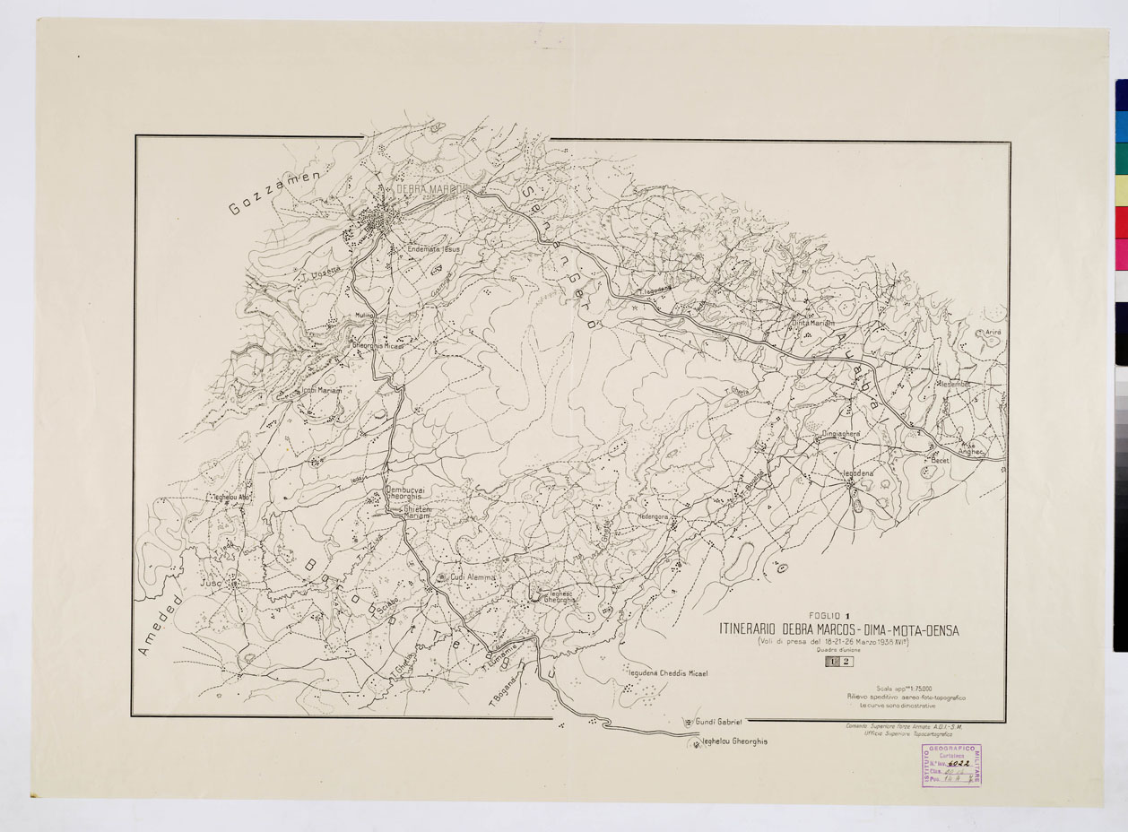 "(VOLI DI PRESA DEL 18-21-26-MARZO 1938). Rilievo speditivo aereo-foto-topografico, le curve sono dimostrative. Comando Superiore Forze Armate A.O.I.-S.M. Ufficio Superiore Topocartografico."