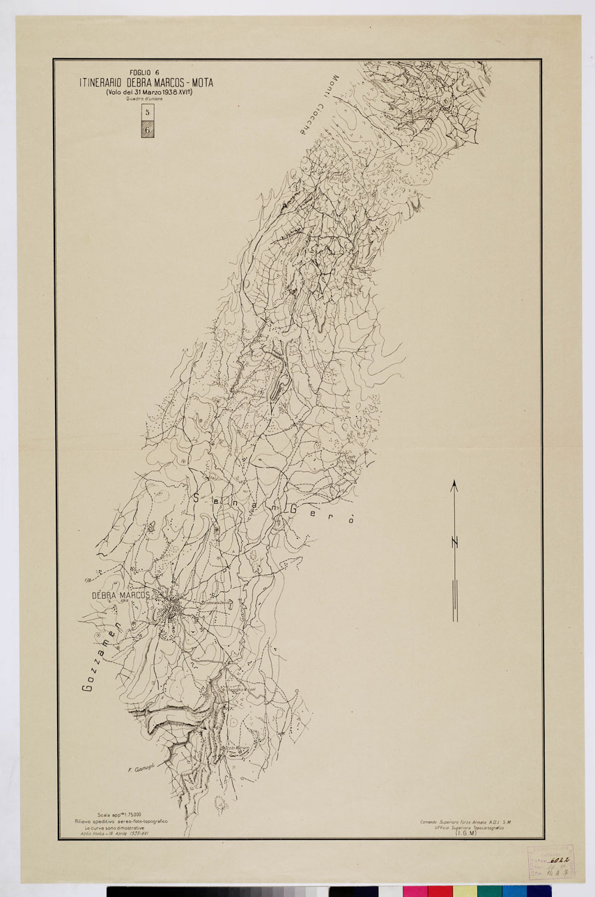 "(VOLI DI PRESA DEL 18-21-26-MARZO 1938). Rilievo speditivo aereo-foto-topografico, le curve sono dimostrative. Comando Superiore Forze Armate A.O.I.-S.M. Ufficio Superiore Topocartografico."