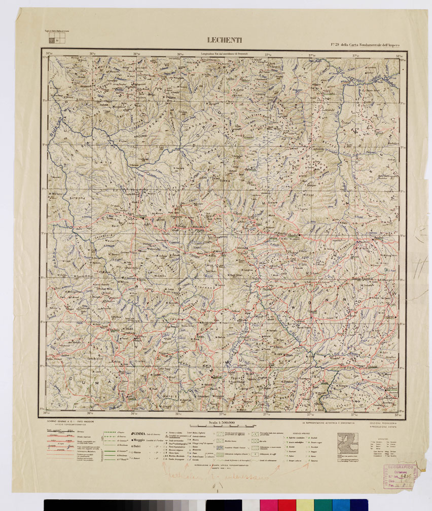 "Rappresentazione orografica a curve di livello. La rappresentazione altimetrica è dimostrativa. In basso la legenda dei segni convenzionali. Governo Generale A.O.I. - Stato Maggiore Ufficio Topocartografico. Riproduzione e stampa: Uffico Topocartografico."