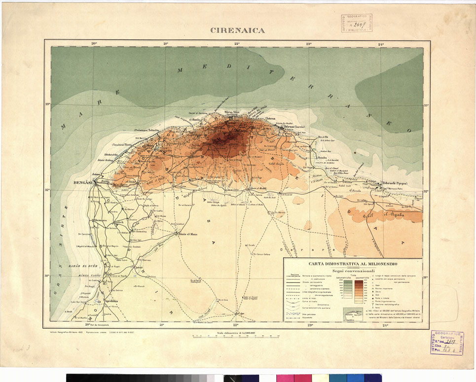 "I.G.M. Un foglio a tinte ipsometriche fondato sui rilievi al 100.000 dell' I.G.M., su le carte dimostrative al 400.000 e al 1:1500.000, gli itinerari del Ministero delle Colonie e itinerari diversi. La carta fu costruita espressamente per il volume di studi geografici, economici e politici " La Cirenaica", a cura di O. Marinelli (A. Vallardi, 1922)."