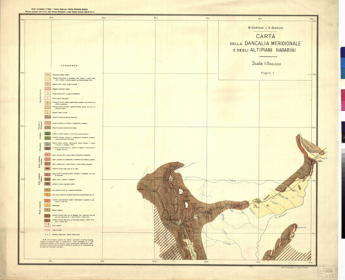 "Rappresentazione orografica a tratteggio. Sul lato sinistro della carta è presente la leggenda dei vari colori. In basso a sinistra vi è una nota che dice: "Per la regione compresa fra Gibuti e Ali-Sabieh e fra Ras Dumeira, Tagiura e il Lago di Assal, si è utilizzata la 'Carte géologique de la Cote française des Somalis' di M. Dreyfuss (1931), mutando però radicalmente l'interpretazione geologica delle formazioni eruttive in accordo con le osservazioni da noi fatte nel circostante retroterra". Autori: M. Gortani e A. Bianchi Reale Accademia d'Italia - Centro Studi per l'Africa Orientale Italiana. Stabilimento Cartografico G. Giardi, Firenze."