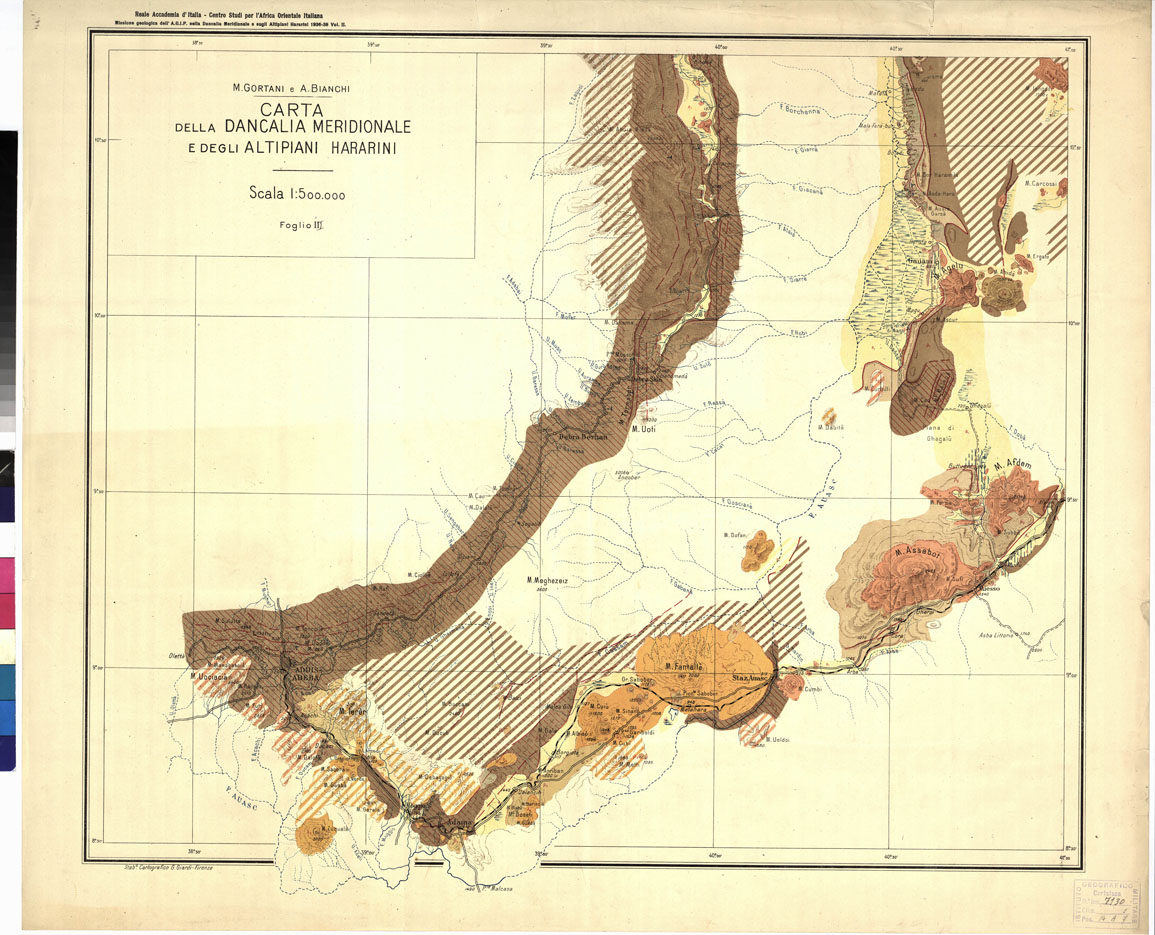 "Rappresentazione orografica a tratteggio. Autori: M. Gortani e A. Bianchi Reale Accademia d'Italia - Centro Studi per l'Africa Orientale Italiana. Stabilimento Cartografico G. Giardi, Firenze."