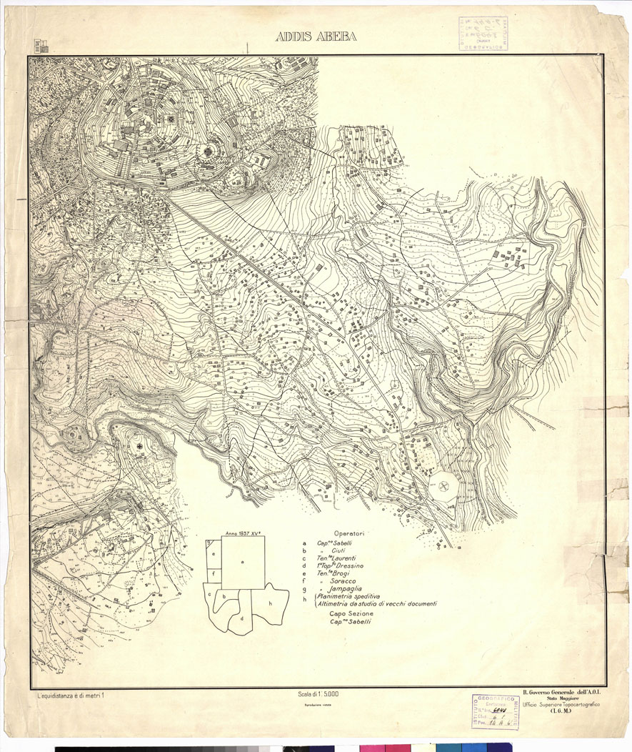 "Rappresentazione orografica a curve di livello, l'equidistanza è di metri 1. In basso l'elenco degli operatori. R. Governo Generale dell'A.O.I. Stato Maggiore Ufficio Superiore Topocartografico (I.G.M.)."
