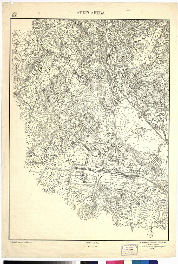 "Rappresentazione orografica a curve di livello, l'equidistanza è di metri 1. R. Governo Generale dell'A.O.I. Stato Maggiore Ufficio Superiore Topocartografico (I.G.M.)."