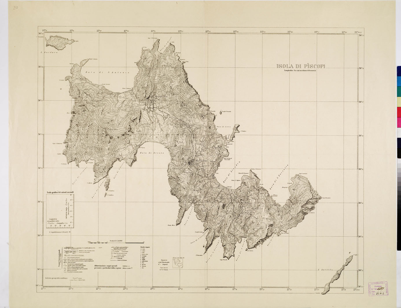 "Rappresentazione orografica a curve di livello l'equidistanza è di metri 10. In basso vi sono i segni convenzionali. Questa carta è riferita al quadro d'unione in allegato a "ISOLE ITALIANE DELL'EGEO - ISOLA DI RODI" al n. di inventario 3349. I.G.M. (FI)"