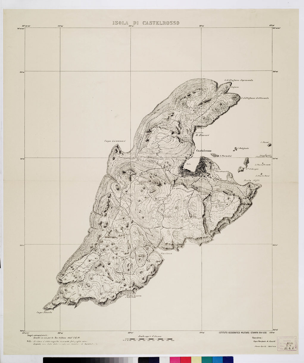 "Rappresentazione orografica a curve di livello. I segni convenzionali sono quelli in uso per le tav. 1:25.000 dell'I.G.M. Il rilievo è stato eseguito mediante fotografie aeree. Le quote sono state determinate con misurazioni barometriche. I.G.M. (FI)."