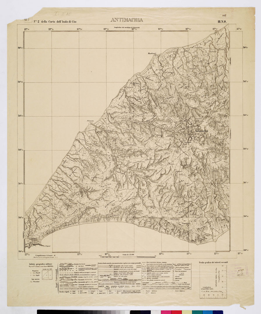 "Rappresentazione orografica a curve di livello l'equidistanza è di metri 10, per le curve punteggiate di metri 5. In basso sono presenti i segni convenzionali. Questo foglio è riferito al quadro d'unione con n. d'inventario 3349 allegato alla carta "ISOLE ITALIANE DELL'EGEO". I.G.M. (FI)."