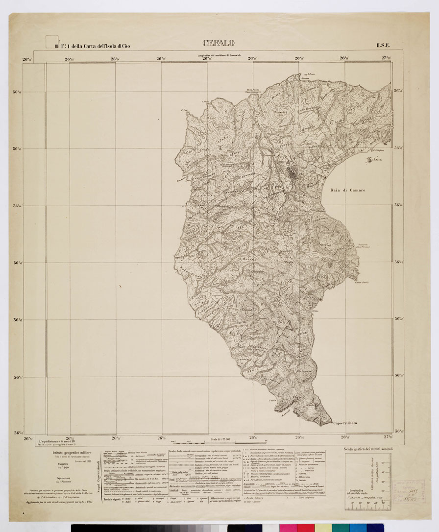 "Rappresentazione orografica a curve di livello l'equidistanza è di metri 10, per le curve punteggiate di metri 5. In basso sono presenti i segni convenzionali. Questo foglio è riferito al quadro d'unione con n. d'inventario 3349 allegato alla carta "ISOLE ITALIANE DELL'EGEO". I.G.M. (FI)."