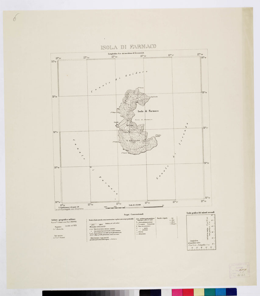 "Rappresentazione orografica a curve di livello l'equidistanza è di metri 10, le curve punteggiate sono dimostrative. In basso sono presenti i segni convenzionali. Questo foglio è riferito al quadro d'unione con n. d'inventario 3349 allegato alla carta "ISOLE ITALIANE DELL'EGEO". I.G.M. (FI)."