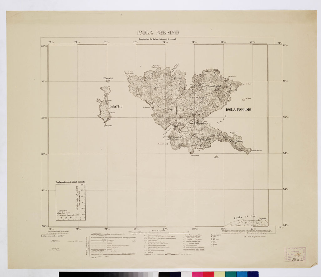 "Rappresentazione orografica a curve di livello l'equidistanza è di metri 10, le curve a tratti sono dimostrative. In basso vi sono i segni convenzionali. Questa carta è riferita al quadro d'unione in allegato a "ISOLE ITALIANE DELL'EGEO - ISOLA DI RODI" al n. di inventario 3349. I.G.M. (FI)"