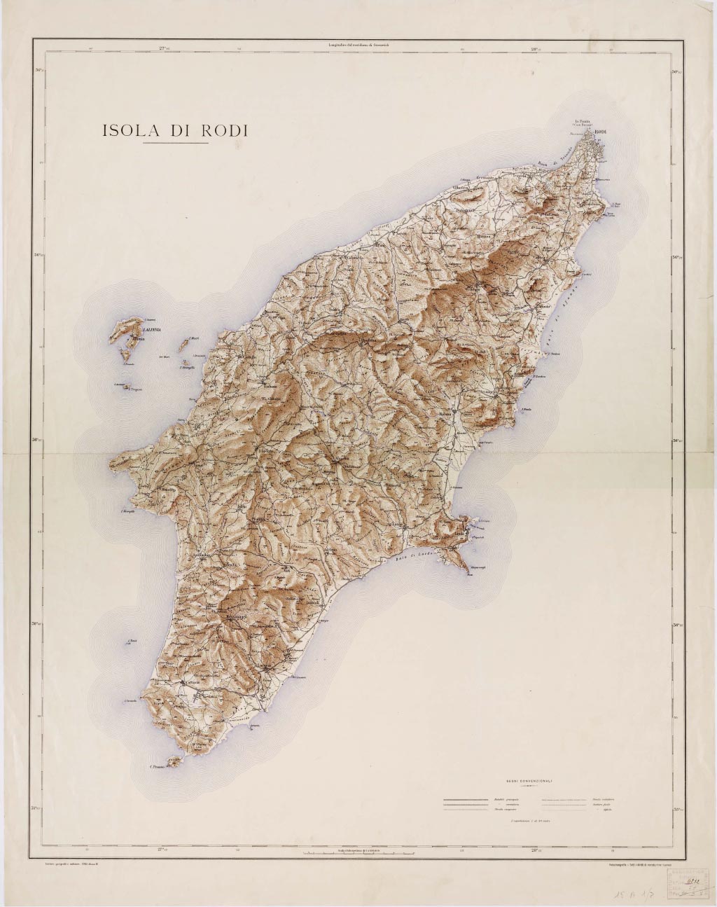 "Rappresentazione orografica a curve di livello e sfumo l'equidistanza è di 50 metri. In basso a destra i segni convenzionali. I.G.M. (FI)."