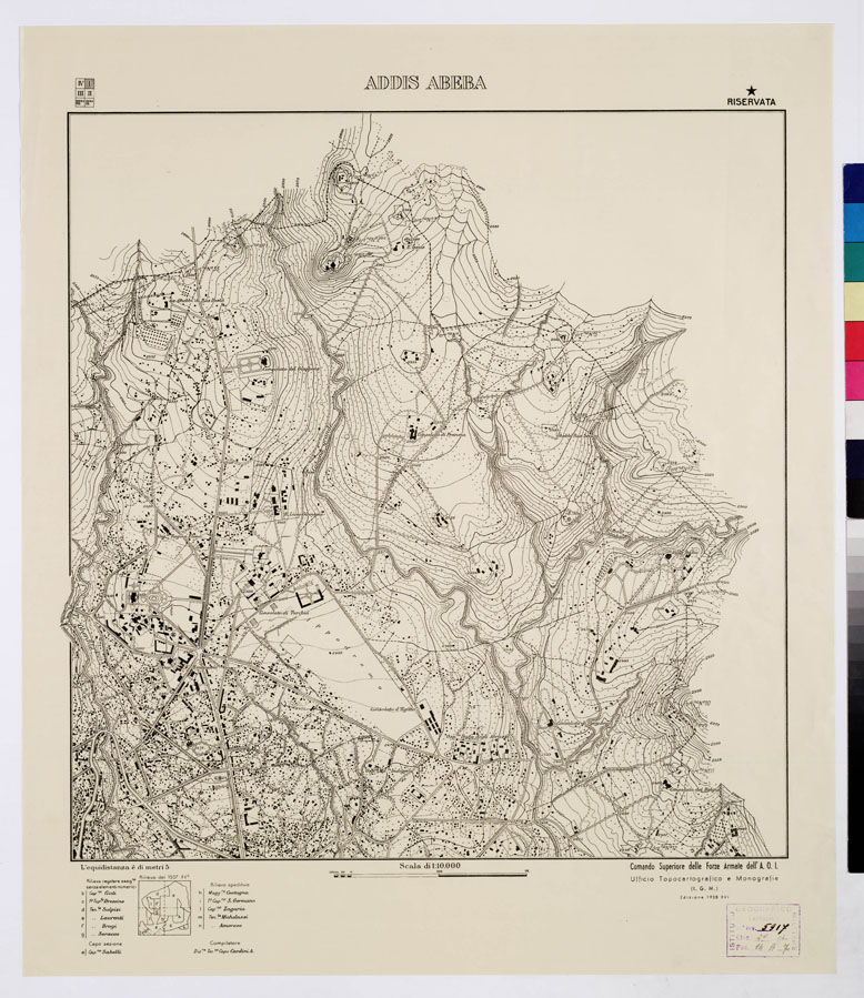 "Rappresentazione orografica a curve di livello, l'equidistanza è di metri 5. Comando Superiore delle Forze Armate dell'A.O.I., Ufficio Topocartografico e Monografie (I.G.M.)."