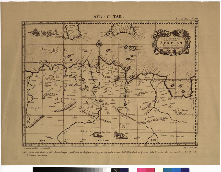 "Documento composto da 3 fogli più la copertina. Fac-simile della Tavola II dell'Orbis Antiqui pubblicato in Amsterdam nel 1730 riprodotto a cura dell'Ufficio Studi del Governo della Cirenaica da un originale che trovasi nella Biblioteca Corfiniana. Rappresentazione orografica a monticelli. Governo della Cirenaica, Ufficio Studi. Tipo-Litografia del Governo della Cirenaica, Bengasi."