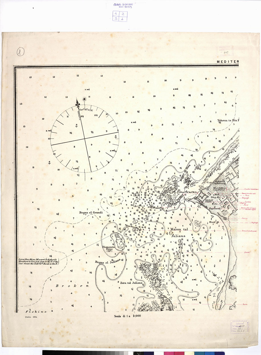 "Carta in 4 fogli stampati in nero con aggiunte a mano (traduzione). In basso nei fogli n. 3 e 4 vi è la veduta della città di Ben Ghazi. I fogli n. 3 e 4 sono stati ristampati nel 1978. Ammiragliato Inglese, Londra."
